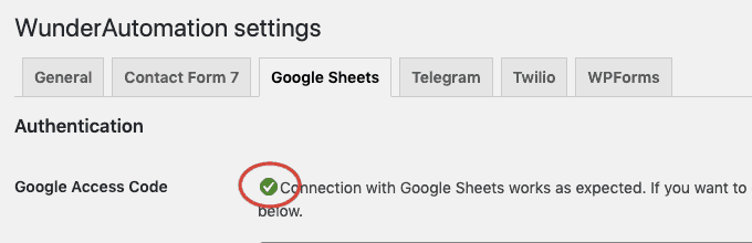 Look for the green checkmark to verify a successful connection between your WordPress installation and your Google account: