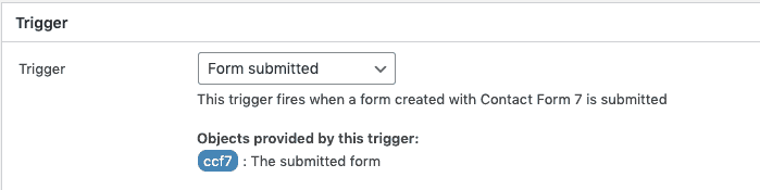 After installing the Contact Form 7 add-on, you now have the option to use ‘Form Submitted’ as a workflow trigger. This is the trigger we’ll use: