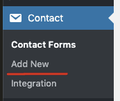 Let’s start with creating the most simple form possible using Contact Form 7. We’re just going to select Contact >> Add New from the dashboard menu:’