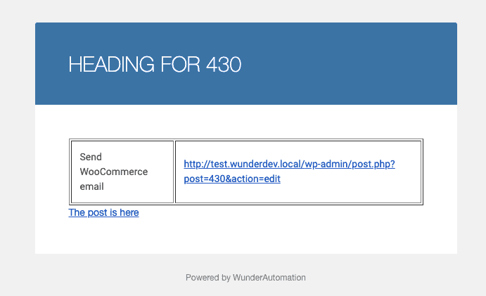 Since we know that a lot of our users are using WunderAutomation together with WooCommerce, we also introduced a way to simply piggy back on the WooCommerce settings. If you have WooCommerce installed, you will find a second HTML email action called “Send WooCommerce email”. Using that action, the sent out email will reuse all the templates and settings already in place for your outgoing WooCommerce emails: