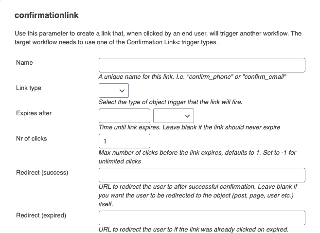 A confirmation link is a parameter that is created by one workflow and is meant to be sent out to the user. Then another workflow can detect when that link is clicked and can perform actions.