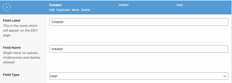| Field | creator | The name (identifier) of the actual custom field. This has to match the field name we assigned in ACF |