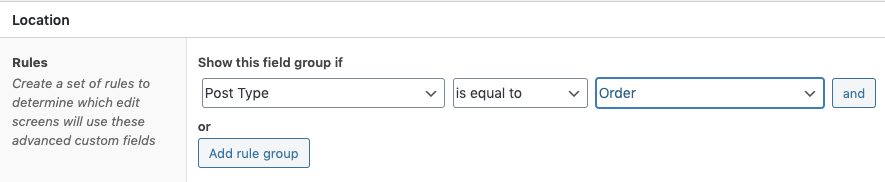 Note that when we type in the field label “Creator”, ACF will automatically suggest that the field name should be “creator”. Next. we’ll scroll down to the Location section and enable this field group on WooCommerce orders:
