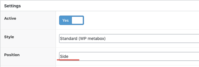 And we’ll make this field appear in a right hand side metabox. Scroll down to the Settings section and change position to Side: