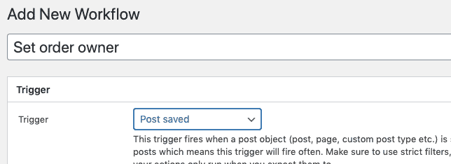 The reason we use Post saved rather than any of the WooCommerce order specific triggers is that this trigger provides two objects to the workflow, the post itself and the user that owns it (author).