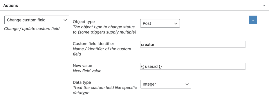 | Object type | Post | The trigger provides two objects, post and user. We want to update a field on the post object |