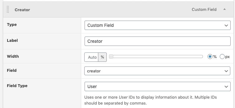 | Field type | User | This instructs Admin Columns that the value found in the custom field is to be treated as the ID of a user. |