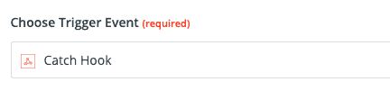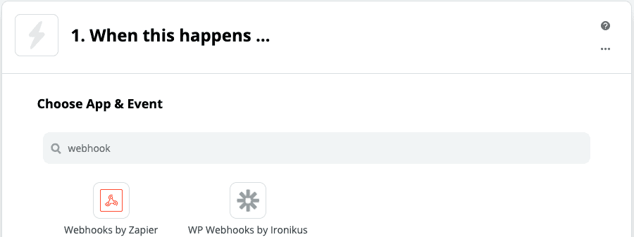 Our first step is to set up a webhook in Zapier. Create a new zap, Zapier will ask you to define a trigger. Start typing webhook and select the built in “Webhooks by Zapier”