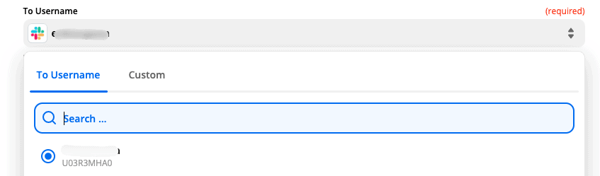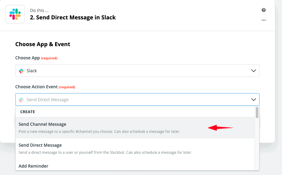 Since we’re sending a message to Slack, we’ll select the Slack app and select to send a Direct message: