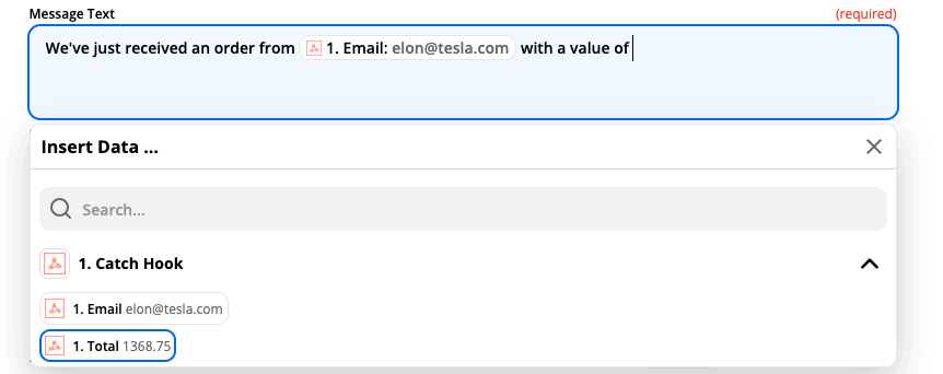 Here’s the interesting part. Since Zapier already knows which data fields we’re sending we can now use them when composing the message:
