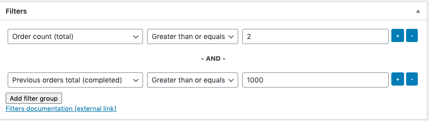 We’ve added Order count and order sum filters for WooCommerce orders. These let’s you filter out actions depending on the count of previous orders or the total sum of all previous orders for a customer.