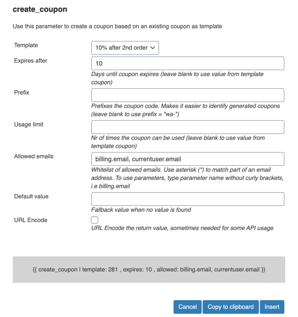 WooCommerce coupons are now possible to truly personalise using the “Allowed email” modifier. Note that you can use any other parameter such as billing.email, but you have to skip the curly brackets when doing so (because we haven’t figured out a way to resolve parameter placeholders inside other parameter placeholders, yet):