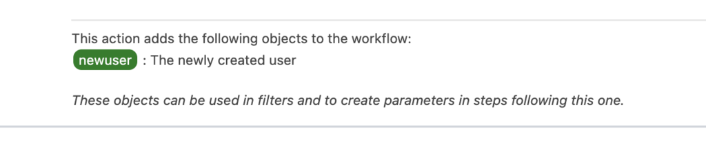 The next big change in this new version is a little less obvious. As before each trigger will supply one or more objects into the workflow. A less known feature was that some actions also added new objects. This is now made much more visible in the editor. For example the “Add user” action now clearly lets you know that it will add an extra user object named “newuser”: